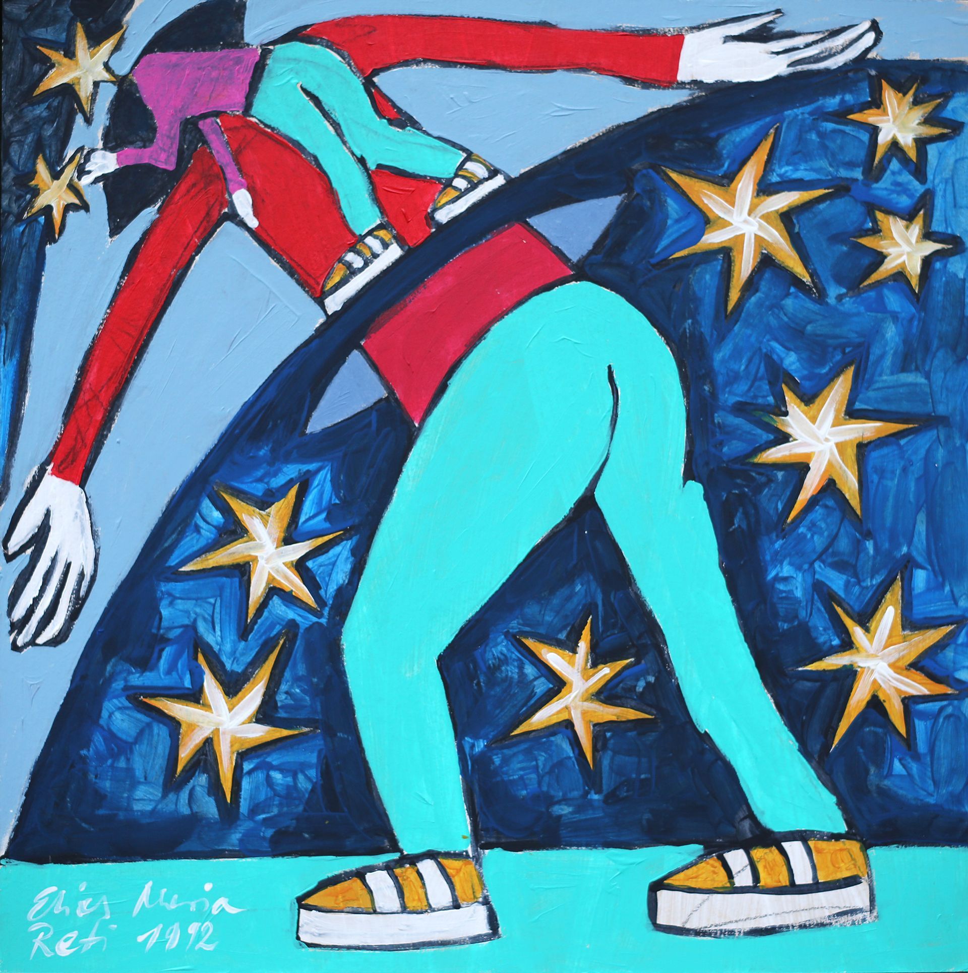 Bildbeispiel oben: „Hosenverträger Nr. 1“, Elias Maria Reti, 1982. Acryl auf MDF. 55 cm. x 55 cm.